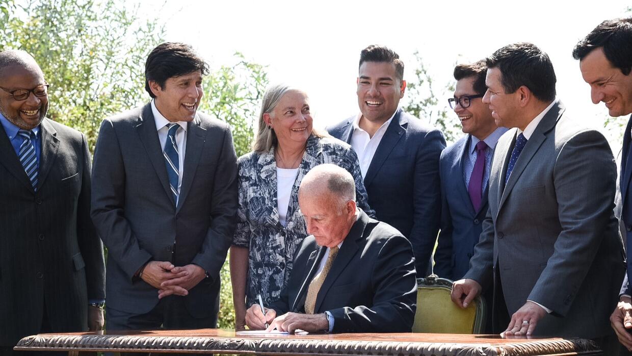 El gobernador de California, Jerry Brown, firma la ley SB 32.